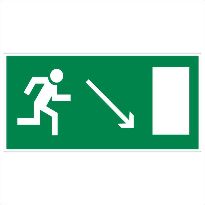 «Направление к эвакуационному выходу направо вниз» фиксируется на поверхности стен внутри здания. Знак информирует о путях эвакуации при пожаре, наступлении иной экстренной ситуации, помогая быстрее пройти опасный участок. Относится к обязательным для установки в учреждениях различного типа, на производствах, в общественных сооружениях и прочих местах массового скопления людей. Указывает направление движения вправо и вниз по имеющей наклон плоскости из горящего помещения в безопасную зону или к выходу из здания.