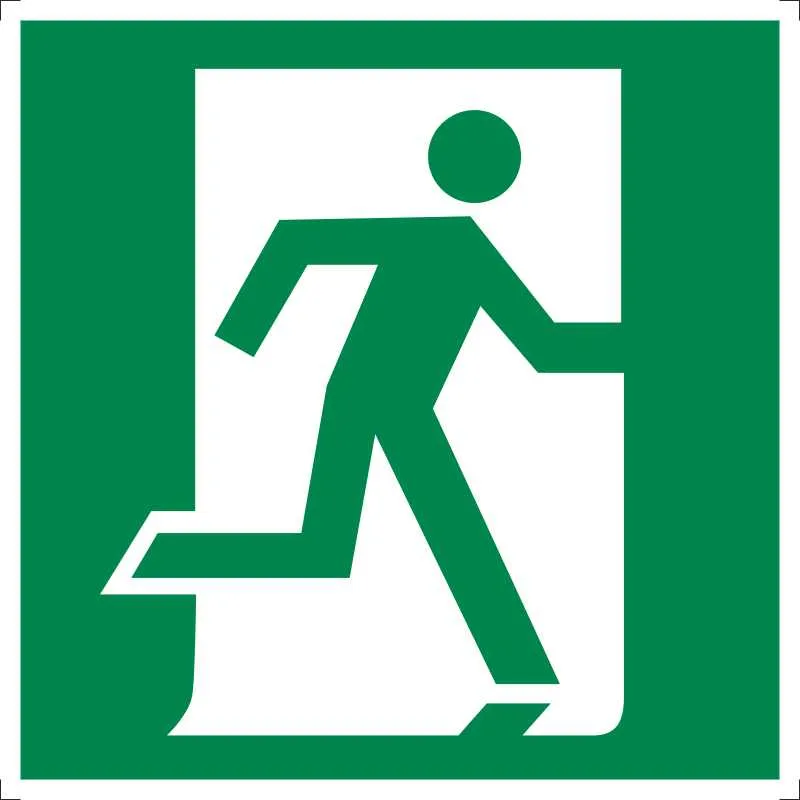 Знак безопасности, обозначающий направление к эвакуационному выходу направо, «Выход здесь (правосторонний)» используется в рамках охраны труда и техники безопасности для маркировки производственных помещений на предприятии. Устанавливается там, где проходят пути эвакуации, над дверями или на самих дверях. Может использоваться в комбинации со стрелкой, указывающей направление движения, и как пиктограмма, дополняющая световые указатели выхода. В соответствии с нормативами должен фиксироваться в таком положении, чтобы совпадать с направлением движения к выходу для эвакуации.