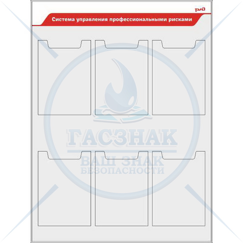 Стенд. Стенд Уголок по охране труда ( 4 кармана формата А4, плоских, 2 кармана формата А4, объемных) стиль РЖД с логотипом, Логотип (1000х1000; Пластик ПВХ 4 мм, алюминиевый профиль; )