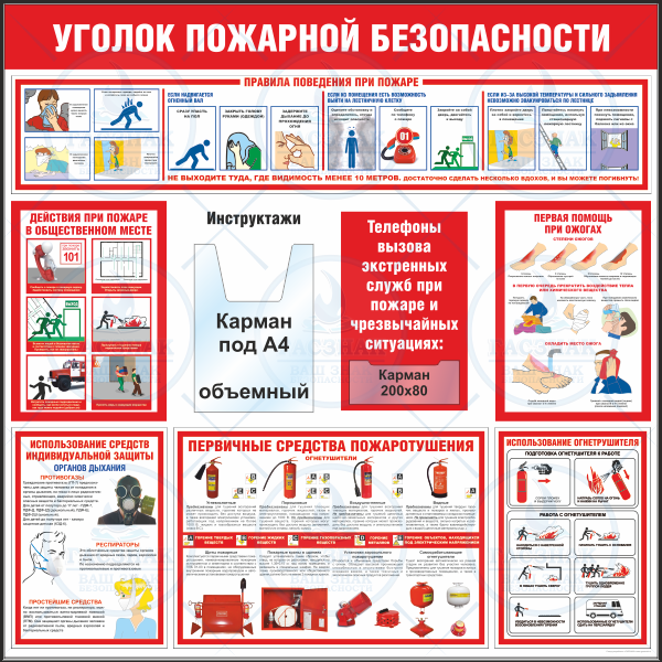 Стенд Пожарная безопасность, 6 плакатов А3 (1100х1100; Пластик ПВХ 4 мм, алюминиевый профиль; )